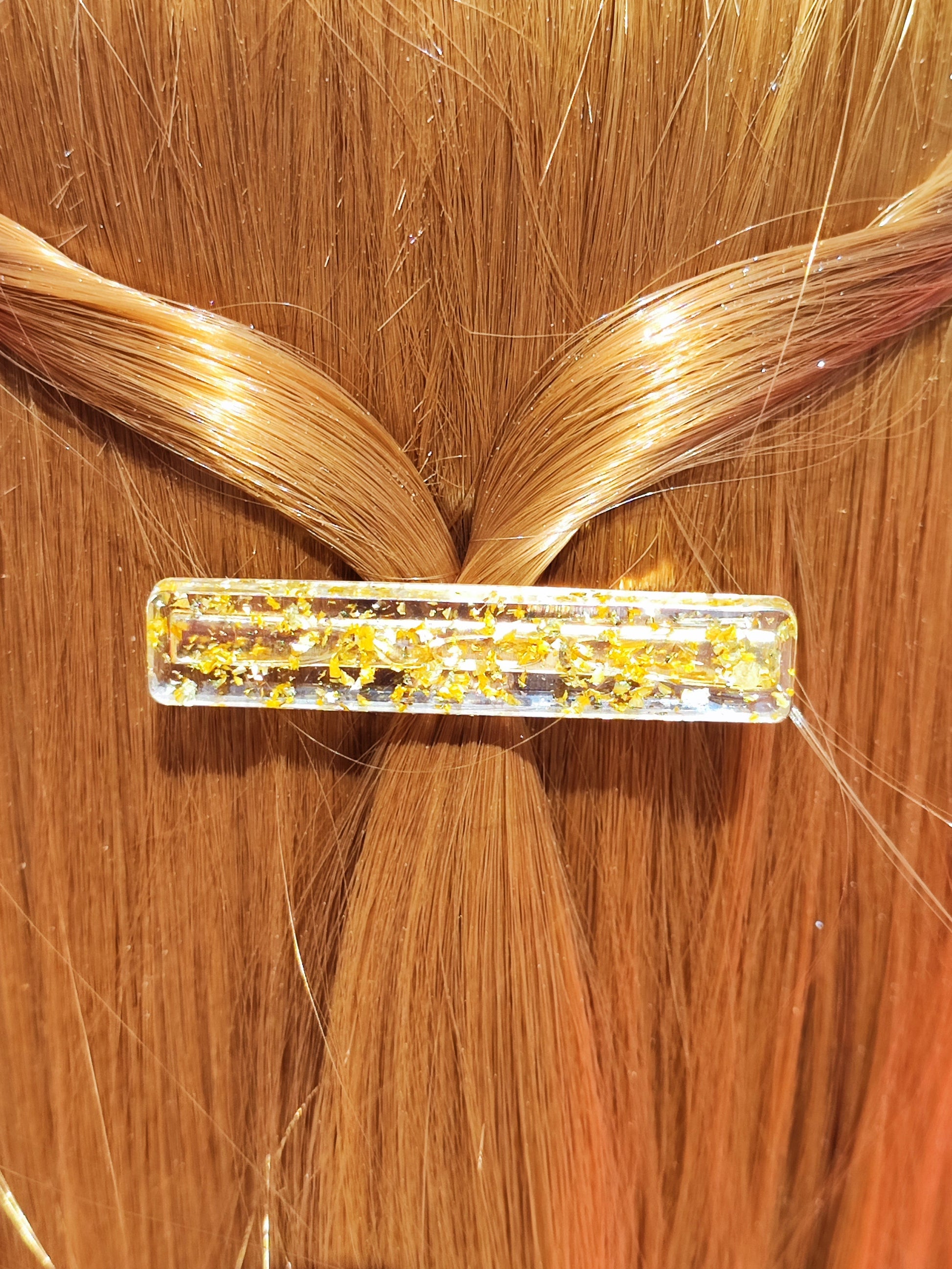 Matériaux : Barrette en acier / Résine époxy et Résine UV, colorant ou poudre Mica / Diverses incrustations