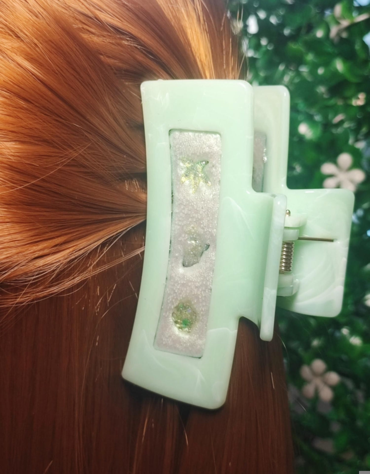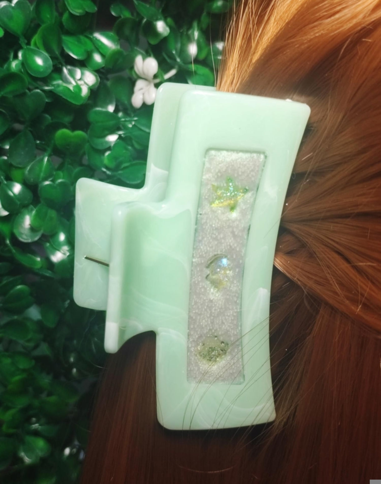 Couleurs : Pince Verte et blanche / Résine transparente, Blanche nacrée reflets verts.