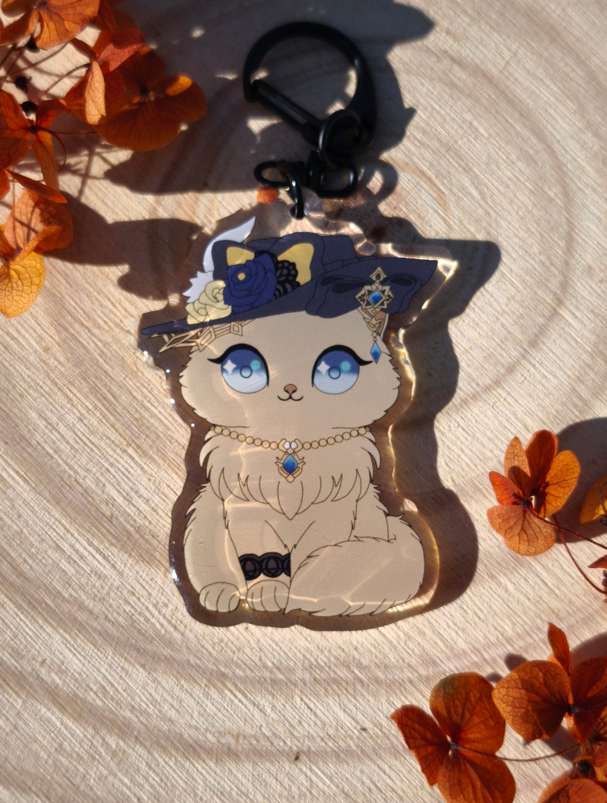 Ce porte-clés unique en résine époxy et acrylique fait partie de la collection "Genshin Cats". L'illustration, dessinée par nos soins, représente Navia, un personnage du jeu Genshin Impact.